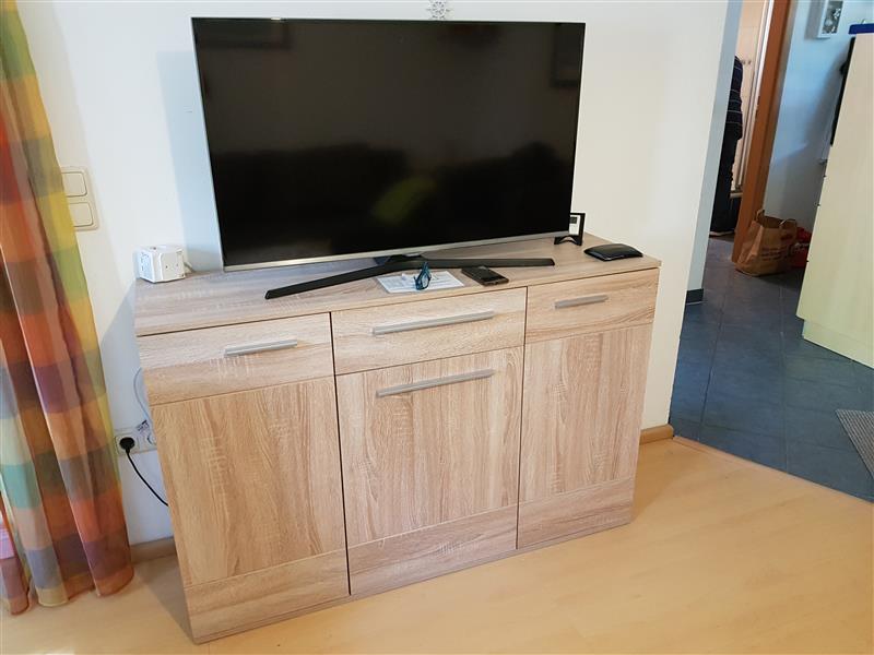 Der Wohnbereich umfasst ein Sofa mit Fernseher und Esstisch. Neben einer offenen Gartenfläche verfügt der Bungalow über eine überdachte Terrasse. Grill, Tisch und Stühle für einen gemütlichen Grillabend stehen zur Verfügung.