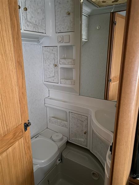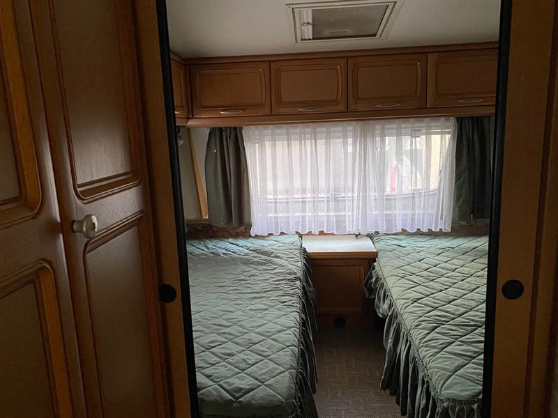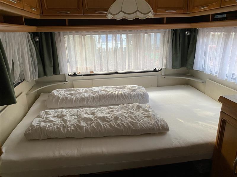 Im Wohnwagen befinden sich ein Doppelbett mit Komfortmatratze (kein unbequemes Schlafen auf einer umgebauten Sitzecke) und im abtrennbaren hinteren Bereich zwei Einzelbetten. Zur weiteren Ausstattung gehören ein Waschbereich mit Nottoilette, ein Küchenbereich mit allen notwendigen Utensilien, ein Flachbild-TV und viele Schränke als Stauraum.