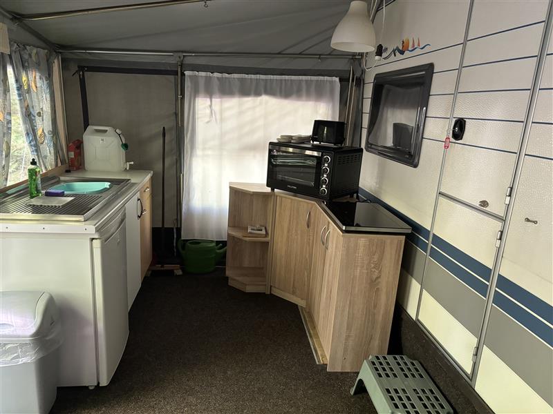 Das Vorzelt teilt sich in einen Küchenbereich mit Kühlschrank, Spülbecken und Kochecke (Backofen und Induktionsherdplatten) und einen Sitzbereich mit einem Tisch, vier Stühlen, einem Sideboard und einem weiteren TV. An kühleren Tagen kann der Wohnwagen bzw. das Vorzelt mit einer Elektrostandheizung und einem Gasheizstrahler beheizt werden (Gasflaschen sind am Minigolfplatz erhältlich).