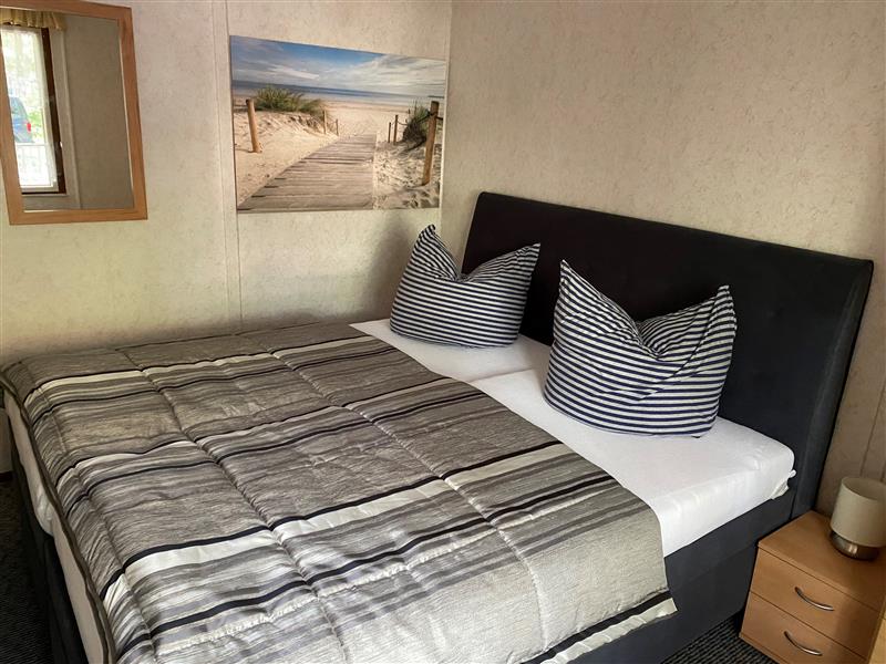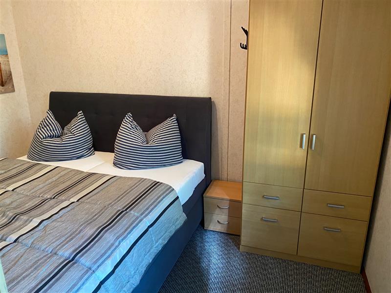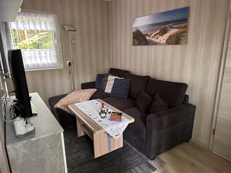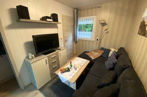 Er präsentiert sich in einem ordentlichen und sauberen Zustand und besitzt einen Wohnessraum mit einer Wohlfühlcouch, Schlafraum mit einem großen Doppelbett und eine abgeteilte Küche. Der Küchenbereich ist mit einer Einbauküche ausgestattet, welche u.a. einen Herd mit Ceranfeld und Backofen, eine Kühl- Gefrierkombination, Kaffeemaschine für Filterkaffee, Toaster u.dgl. bietet. Im gefliesten Bad finden Sie WC+ Waschbecken mit fließendem Kalt- und Warmwasser. Ein Kabel-TV mit Flachbildschirm und eine HiFi-Anlage dienen u. a. zur Unterhaltung. Der Außenbereich zeigt sich mit einer überdachten Terrasse und Gartenmöbeln. Duschmöglichkeiten, Waschmaschinen und Wäschetrockner befinden sich ca. 50 m vom Bungalow entfernt, im Waschhaus.