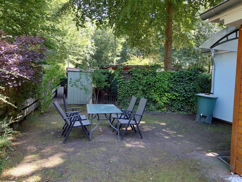 Es gibt eine überdachte Terrasse mit Holzmöbeln und im hinteren sonnigen Bereich stehen