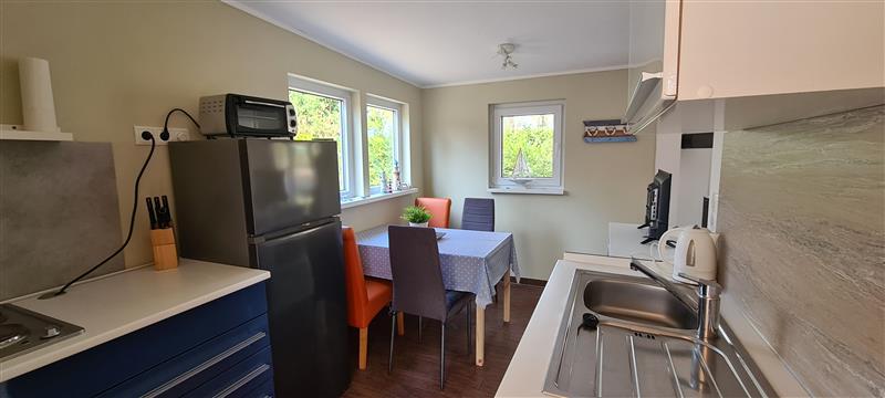 Küche:2 Kochplatten, Kühlschrank mit Gefrierfach, Kaffeemaschine, Toaster, Wasserkocher, ausreichend Geschirr, Töpfe und Gläser