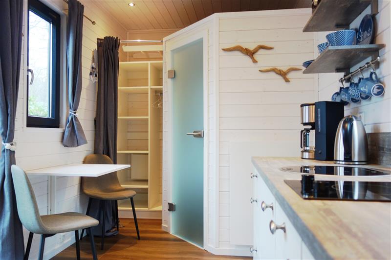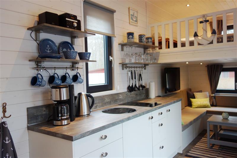 Das erste Tiny House in Graal-Müritz steht auf dem Ostseecamp. Das ca. 18 qm große Häuschen auf Rädern ist für 2 Personen geeignet und verfügt über eine Küchenzeile mit einem Cerankochfeld (2 Kochfelder), einem Kühlschrank, einer Spüle, einem Wasserkocher und einer Kaffeemaschine.