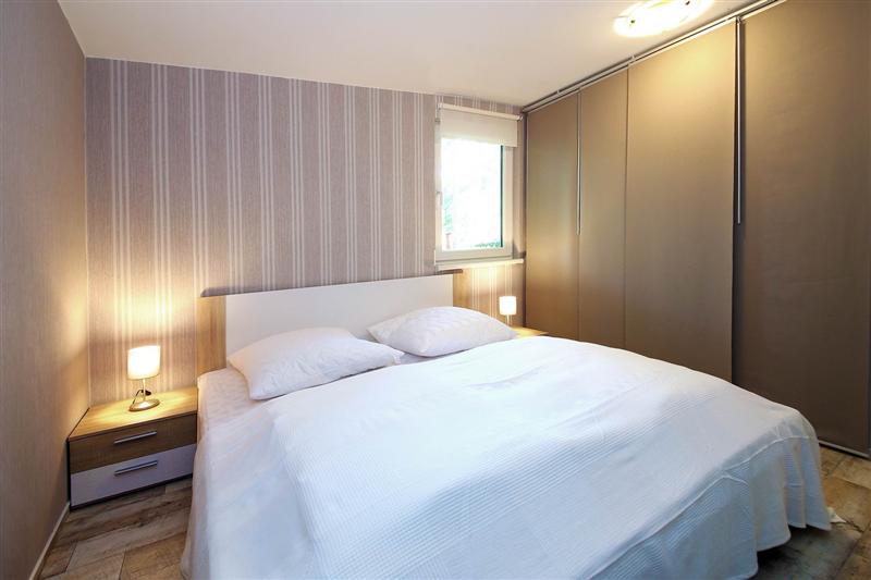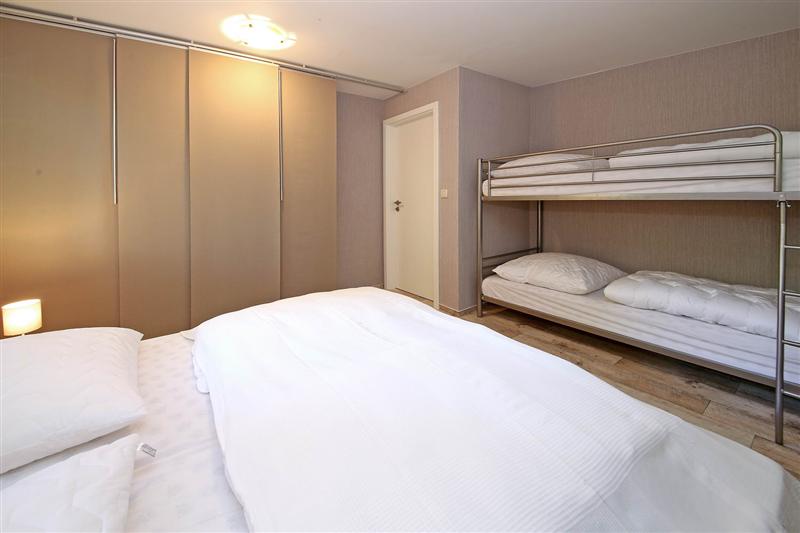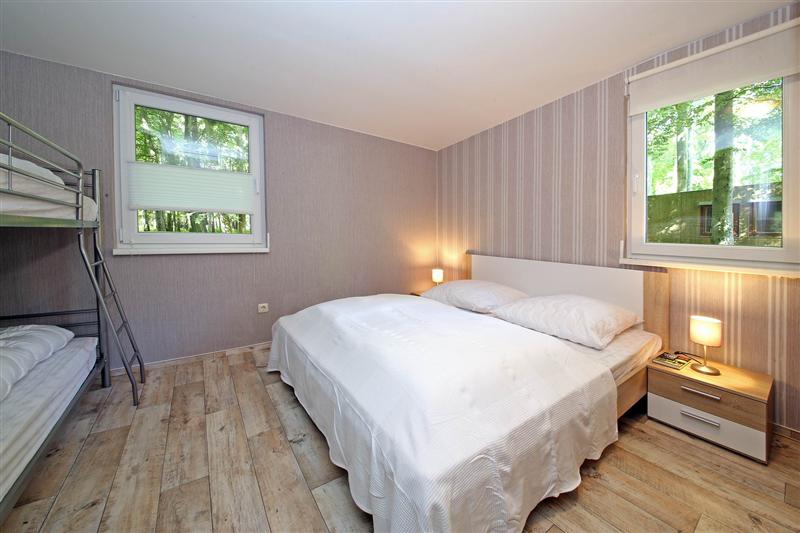Der Bungalow verfügt über einen weiträumigen Schlafraum mit Etagen- und Doppelbett mit praktischen Nachtschränken und hinter textilen Schiebelementen verborgenem voluminösem Stauraum für Ihre persönlichen Dinge.