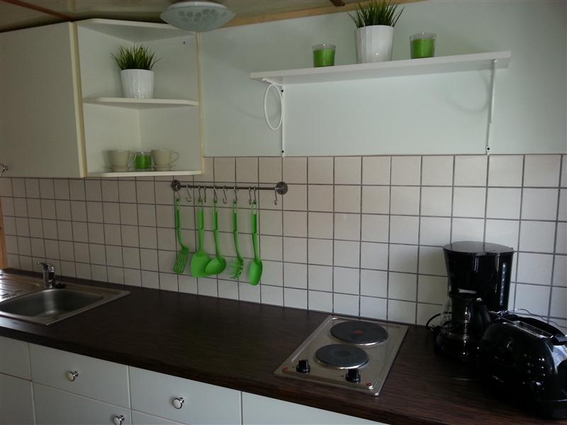 **Küchenzeile**: Elektrokochfelder, Kühlschrank mit Gefrierfach, Mikrowellengrill, Wasserkocher, Toaster, Kaffeemaschine, große Auswahl an Geschirr und Zubehör