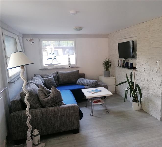 Wohnzimmer: Esstisch mit 4 Stühlen + 1 Kinder-Hochstuhl, Couch mit Ottomane, Flachbildfernseher, DVD-Player mit DVD´s, Büchersammlung & Gesellschaftsspiele für groß und klein