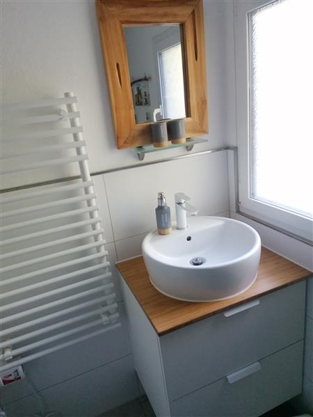 Bad: Waschbecken mit Unterschrank, WC, Dusche